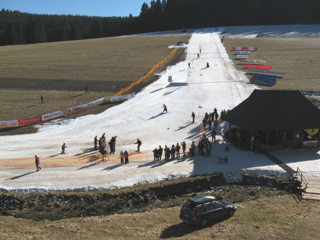 Schollach hat ein Problem, das in den vergangenen Jahren eher selten auftrat: Es fehlt an Schnee und dies ausgerechnet am Jubiläumswochenende. Am kommenden Wochenende soll an die Erfindung des Schollachers Robert Winterhalder, der vor genau 100 Jahren den ersten Skilift der Welt entwickelte, mit einer Großveranstaltung erinnert werden. Doch an den Hängen rund um den Schneckenhof gibt es nur grüne Wiesen. Klaus Schuler, Gemeinderatsmitglied und Mitorganisator des Jubiläumsfestes, sah sich gegenüber den Sponsoren verpflichtet, trotz des Schneemangels das Jubiläum nicht platzen zu lassen. Die Außenveranstaltungen sollten weitestgehend stattfinden können. Also musste Schnee her und dies in Hülle und Fülle, um einen ganzen Hang so präparieren zu können, dass hier ein Wintersportprogramm stattfinden kann. Wenn es darum geht etwas zu organisieren und auf die Beine zu stellen, dann entwickeln die Schollacher einen Zusammenhalt, der seinesgleichen sucht. Stundenlang hing