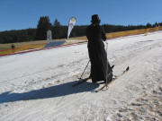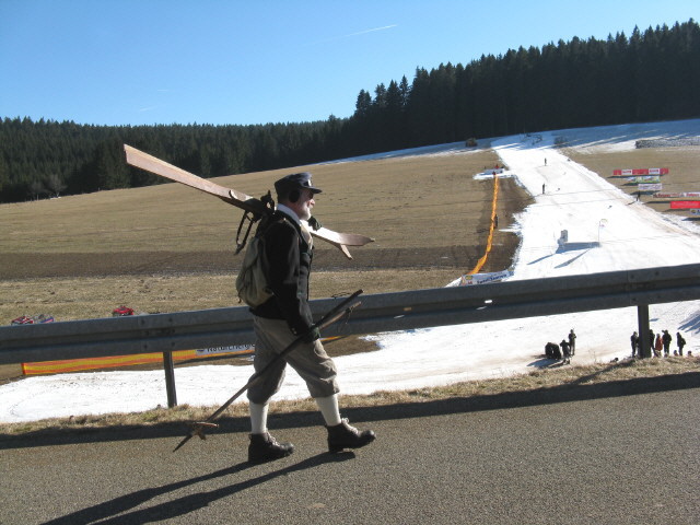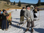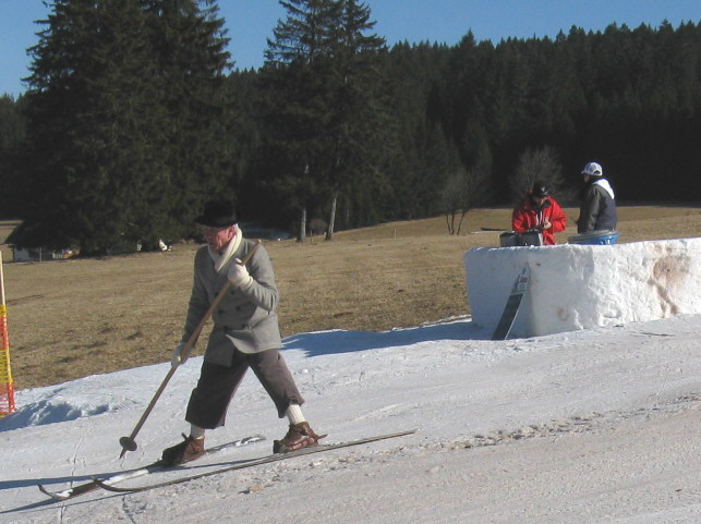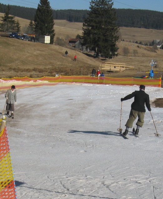Am Freitag noch Dauernebel am ersten Skilift der Welt beim Schneckenhof in Schollach, heute am Samstag Jubiläumswetter mit strahlendem Sonnenschein, aber einem eisigen Ostwind. Die Strasse zwischen Bergerhof (Altevogtshof) und Schollach war gesperrt und gehörte den zahlreichen Zuschauern, Volksfeststimmung. Und die Mitglieeder vom Telemarktclub zeigten, wie man vor 100 Jahren hier den Hang hinabsauste - mit zwei Stöcken oder auch nur einem Stock.