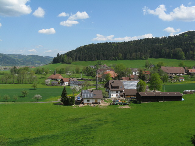 Blick nach Norden zu Langenbachhof (rechts), Maierhof und Köbelehof (links) am 3.9.2004   3.5.2008 am Stall