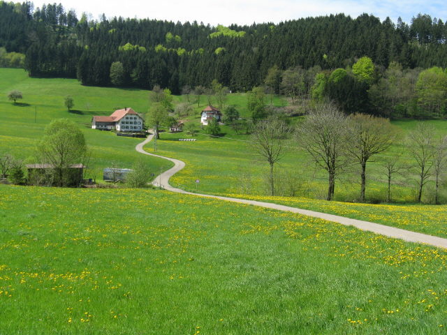 Blick nach Norden zu Langenbachhof (rechts), Maierhof und Köbelehof (links) am 3.9.2004 Blick vom Berghäusle beim Maierhof nach Süden über den Zinken am 3.5.2008