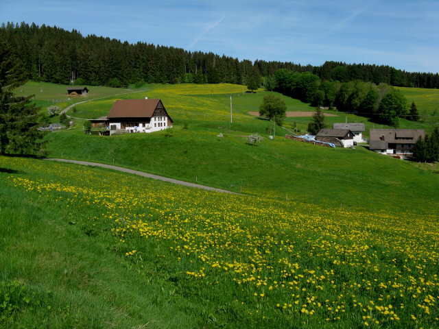 Zwischen den von Nord nach Süd verlaufenden Tälern der Schwarza (im Westen) und Mettma (im Osten) liegt ein Höhenrücken - sonnig und frei, da großenteils mit Wiesen und auch Äckern (bei Brenden wachsen gute Kartoffeln). Vornehmlich nur die steil abfallende Talhänge runter zur wilden Schwarza und braveren Mettma sind bewaldet und schattig. Auf dem Höhenrücken läßt es sich gut wandern - nebelfrei, mit herrlichem Alpenblick, warm, von Ort zu Ort: Schluchsee-Schönenbach (958 m), Grafenhausen-Staufen (940 m), Bulgenbach (871 m), Ühlingen-Brenden (896 m). Auch der Kapellenweg bietet sich an.