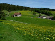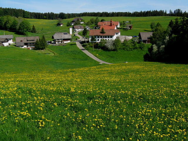 Bulgenbach liegt auf halbem weg zwischen Staufen und der Heidenmühle an der Mettma - idyllischer Weiler inmitten weiten Wiesen. Gasthaus um Schwanen und St.Laurentiuskirche.