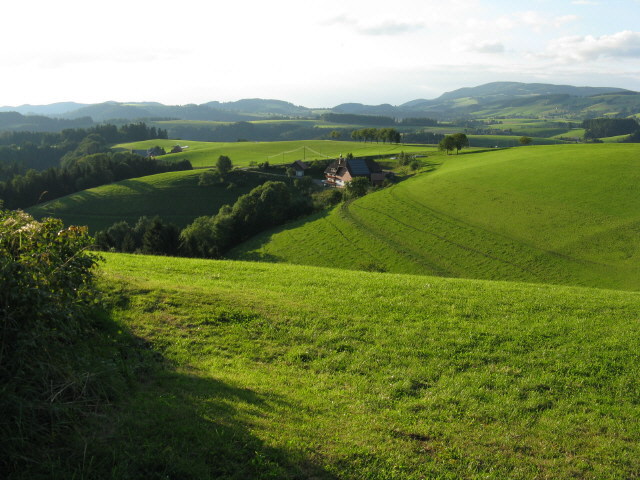 Steigweg am 18.7.2011: Blick nach Osten übers Rufenhäusle (rechts) Steigweg am 18.7.2011: Blick nach Nordosten über den Schweigbrunnen Steigweg am 18.7.2011: Blick nach Norden über die Hügel von Zwerisberg, Oberibental, Schmittenbach, Heitzmannsberg zum Kandel