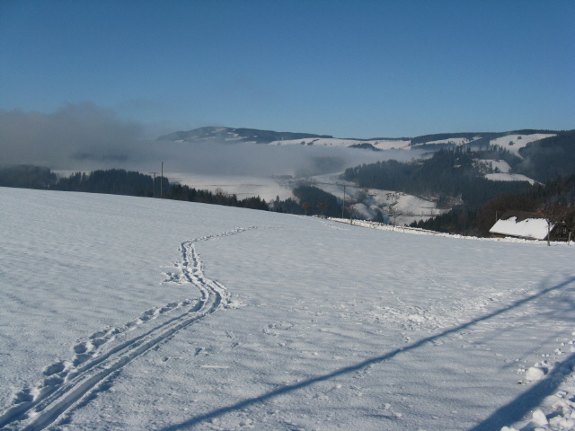 Am 8.12.2008 liegen Freiburg mitsamt Dreisamtal unter einer Dunstglocke - hier oben am Steigweg ist die Luft klar und die Sonne scheint. Vom Steighof wandern wir auf dem Höhenrücken der Steig nach Osten, bis der Steigweg in den Bärtelweg mündet. Dann gehts weiter "Auf der Spirzen" hoch zu den Schweighöfen.