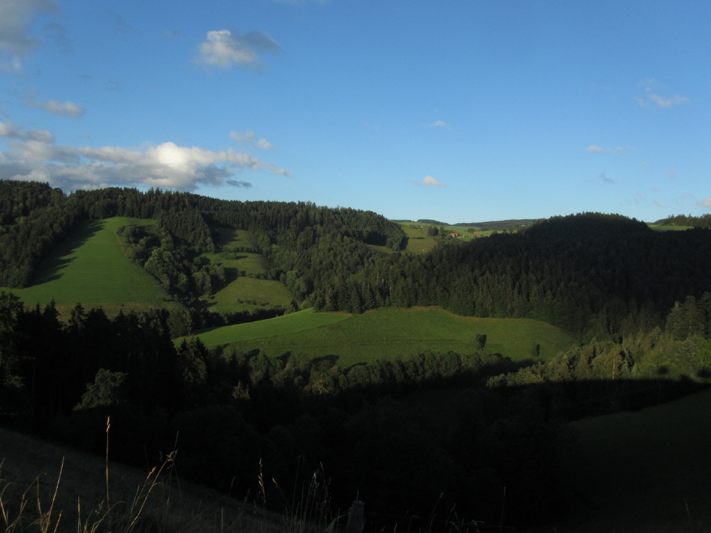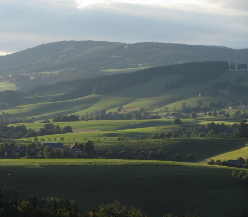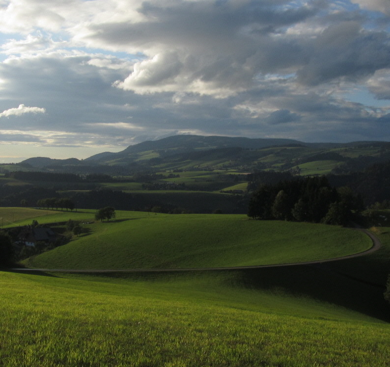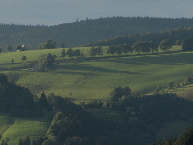 Traumblick nach Nordwesten über Rotenbauernhof und Metzgershäusle (links) nach St. Peter und zum Kandel am 25.8.2008 Tele-Blick vom Steighof über Zwerisberg und St.Peter-Schmittenbach zum Kandel am 25.8.2008 abends 18 Uhr Blick vom Steigweg nach Nordwesten übers  Wagensteigtal zum Zwerisberg bis hin zum St.Peter und Kandel am 25.8.2008 - Dach vom Steighof rechts