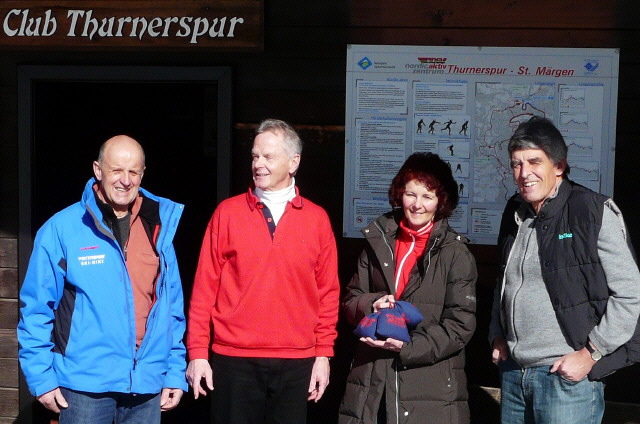 St. Märgen (glü.) Der Förderverein „Club Thurnerspur“, Betreiber des Skilanglaufzentrums Thurnerspur, konnte am vergangenen Samstag sein viertausendstes Mitglied willkommen heißen. Im Rahmen einer kleinen Feier überreichte der Vereinsvorsitzende Wolf Hockenjos der Breitnauer Langläuferin Gertrud Ruf die ausgelobte Prämie, einen Gutschein im Wert von 200 Euro. Damit ist für den Verein ein Traumziel in Erfüllung gegangen: ein Mitgliederstand, der den Schatzmeister des Vereins vorerst aller Sorgen enthebt. Frühestens in zwei Jahren, zum vierzigjährigen Vereinsjubiläum, hatte man das Fernziel zu erreichen gehofft. Doch die hervorragenden Schneebedingungen der letzten Wochen waren der Mitgliederwerbung spürbar entgegengekommen. Die Thurnerspur, Deutschlands ältestes Langlaufzentrum, wird seit fast vier Jahrzehnten ausschließlich aus Mitgliedsbeiträgen finanziert. Grundsätzlich ist der Loipengenuss von 30 Kilometern stets bestens präparierter Spur in einzigartiger Schwarzwaldlandschaft am Thurner für jedermann unentgeltlich zu haben. Bei der Mitgliederwerbung wird deshalb an den Gemeinsinn der Benutzer appelliert. Als zusätzlicher Anreiz Mitglied zu werden, dient die kostenlose Benutzung des Parkplatzes unmittelbar am Start, wo Nichtmitglieder eine Parkgebühr inklusive Spende für die Loipenwartung von vier Euro zu entrichten haben. Auch der traditionelle heiße Tee in der Blockhütte nach dem Lauf wird Mitgliedern zum halben Preis verkauft. Insofern rechnet sich der Mitgliedsbeitrag von 12 Euro pro Saison rasch.