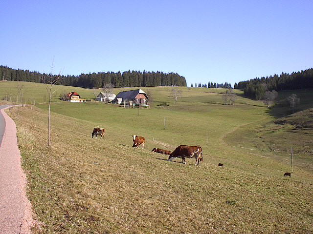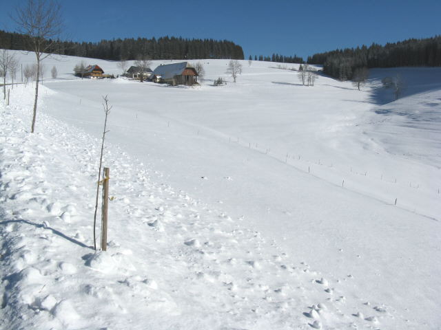 "Vom Lachenhäusle (B 500) schnelle Waldabfahrt (Vorsicht Rechtskurve am Waldausgang) gegen Waldau und gemächlicher auf Waldauer Rundloipe über freies Feld zur Straßenunterführung am Stalterhof. Nach Verlassen der Rundloipe und nach Einmündung der Jostal-Loipe weiter in mäßigem Auf und Ab zum Gasthaus Schweizerhof (1010 m, Bushaltestelle der Linie Neustadt-Waldau-St. Märgen)."