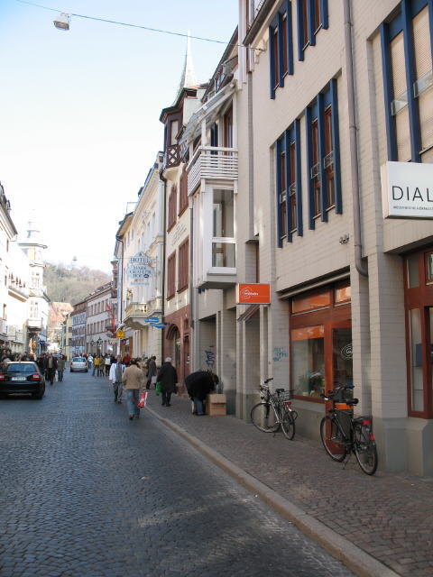 Blick nach Osten in der Gerberau zum Schloßbergturm am 18.3.2006 - Weltladen rechts rot bei Fahrrädern