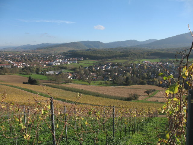 Von Niederweiler gehts zunächst westwärts eben nach Vögisheim, dann hoch zum Luginsland - mit Traumblick vom Jägerdenkmal über Müllheim und Badenweiler. Dann nach Süden am Homberg vorbei nach Auggen. Durch den Ort durch, hoch in die Reben und am Südhang des Hurrbergs und des Himmelbergs auf Schliengen zu. Kurz  vor Schliengen sollte man unbedingt einen Abstecher ostwärts nach Mauchen unternehmen.