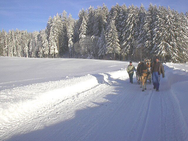 Herr Weber mit dem Pferdeschlitten am 1.2.2004 ... ... auf dem Weg zum Willmenhof