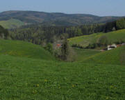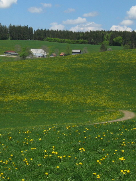 Blick nach Südwesten über den Hinteren Willmenhof zum Heitzmannsberg am 20.4.2011 - gelb leuchtet der Löwenzahn