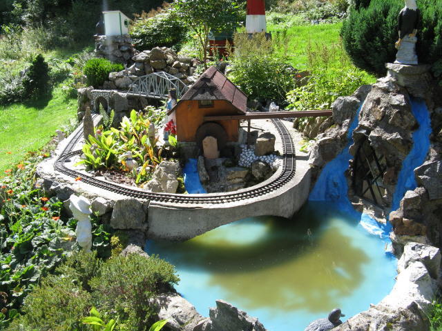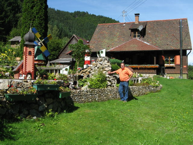 Wer auf dem Zastlersträßchen in Höhe des Scheibenfelsens vorbeiradelt, entdeckt auf der anderen Strassenseite ein Kirchlein mit Zwiebelturm, einen Leuchtturm, einen plätschernden Wasserfall - und dazwischen fährt eine Großspur-Eisenbahn. Seit über 10 Jahren baut Pius Schmidt neben seinem Haus eine wunderschöne Eisenbahnlandschaft "en miniature". Im Winter kommen die Figuren und Accessoirs in den Keller, der Schnee schützt die konstvollen Bauten, und im nächsten Frühjahr macht sich Pius Schmidt daran, seine neuen Ideen umzusetzen. Schön - nicht nur für Kinder!